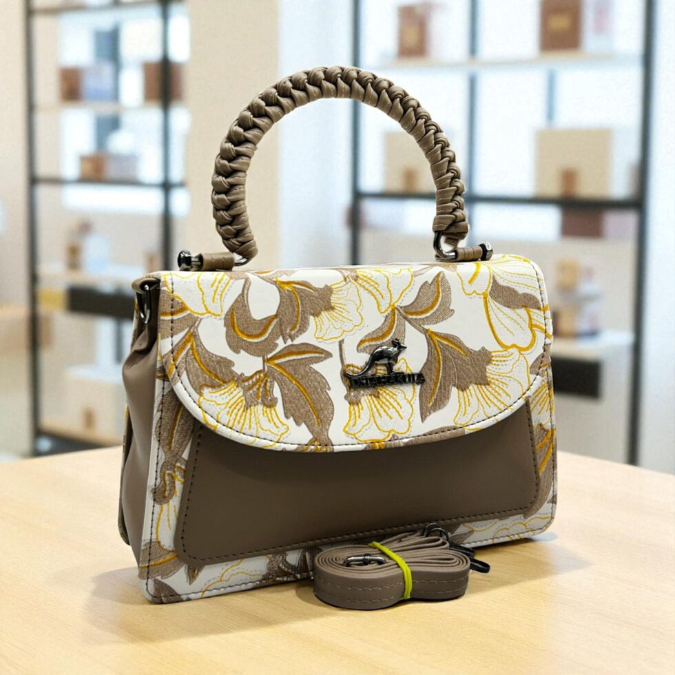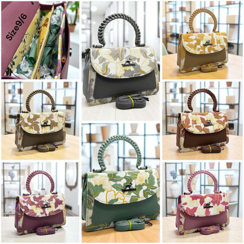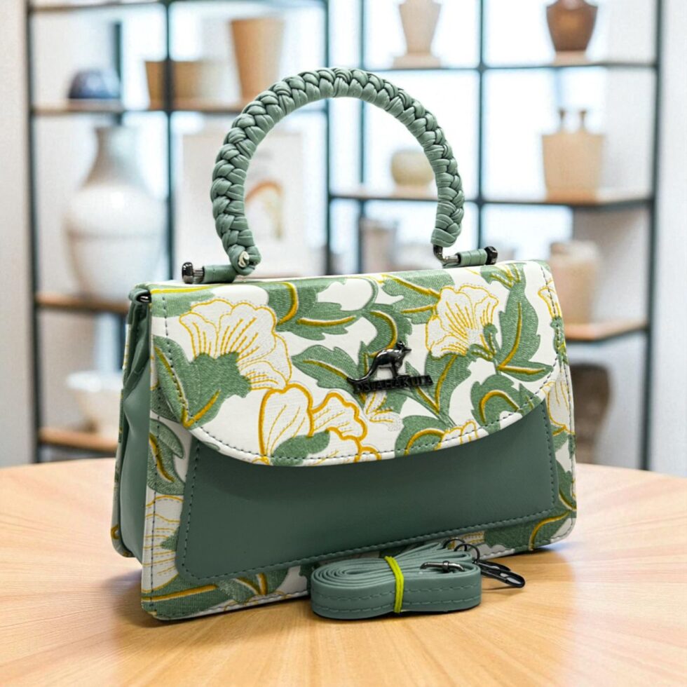 The bag in the image is a stylish, structured handbag featuring a floral and solid color design. Here are the details: